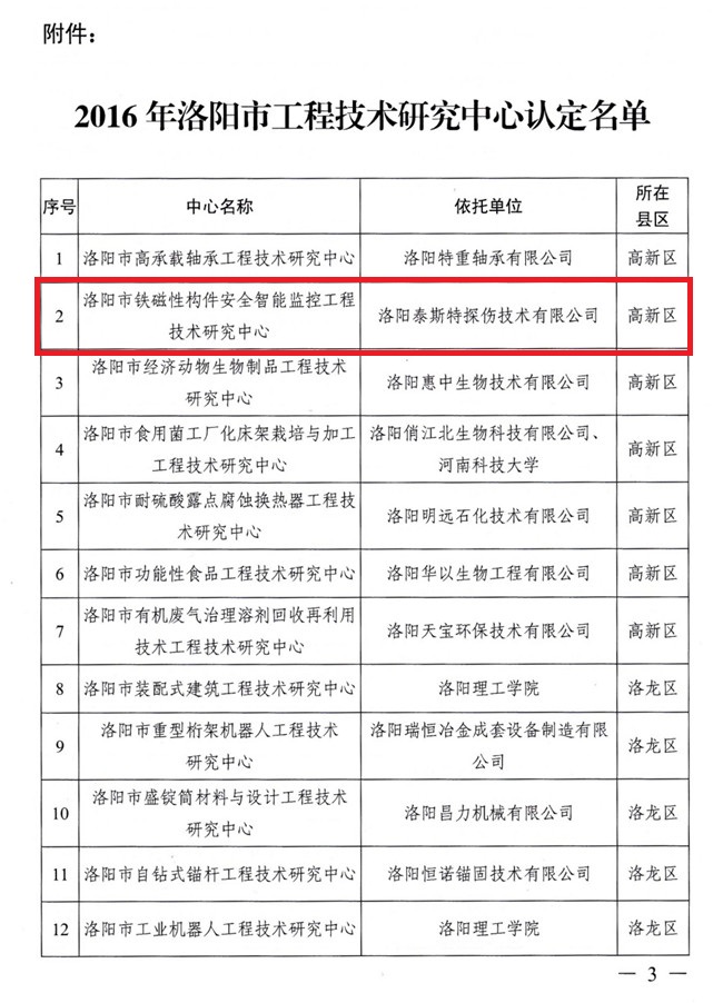 根据《洛阳市工程技术研究中心管理办法》(洛市科【200695号)规定,经组织申报、初审、现场考察、会议评审等评审程序,洛阳泰斯探伤技术有限公司被认定为洛阳市铁磁性构件安智能监控工程技术研究中心。